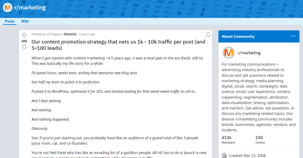 Commenting. Basically, you find relevant audiences, and look out for people asking relevant questions or starting discussions. Who needs your help? Then you respond to those people with helpful information and guide them to your solution. You have to be thoughtful here and aim for a win-win for everyone. The user gets your help, and you get exposure for your product.